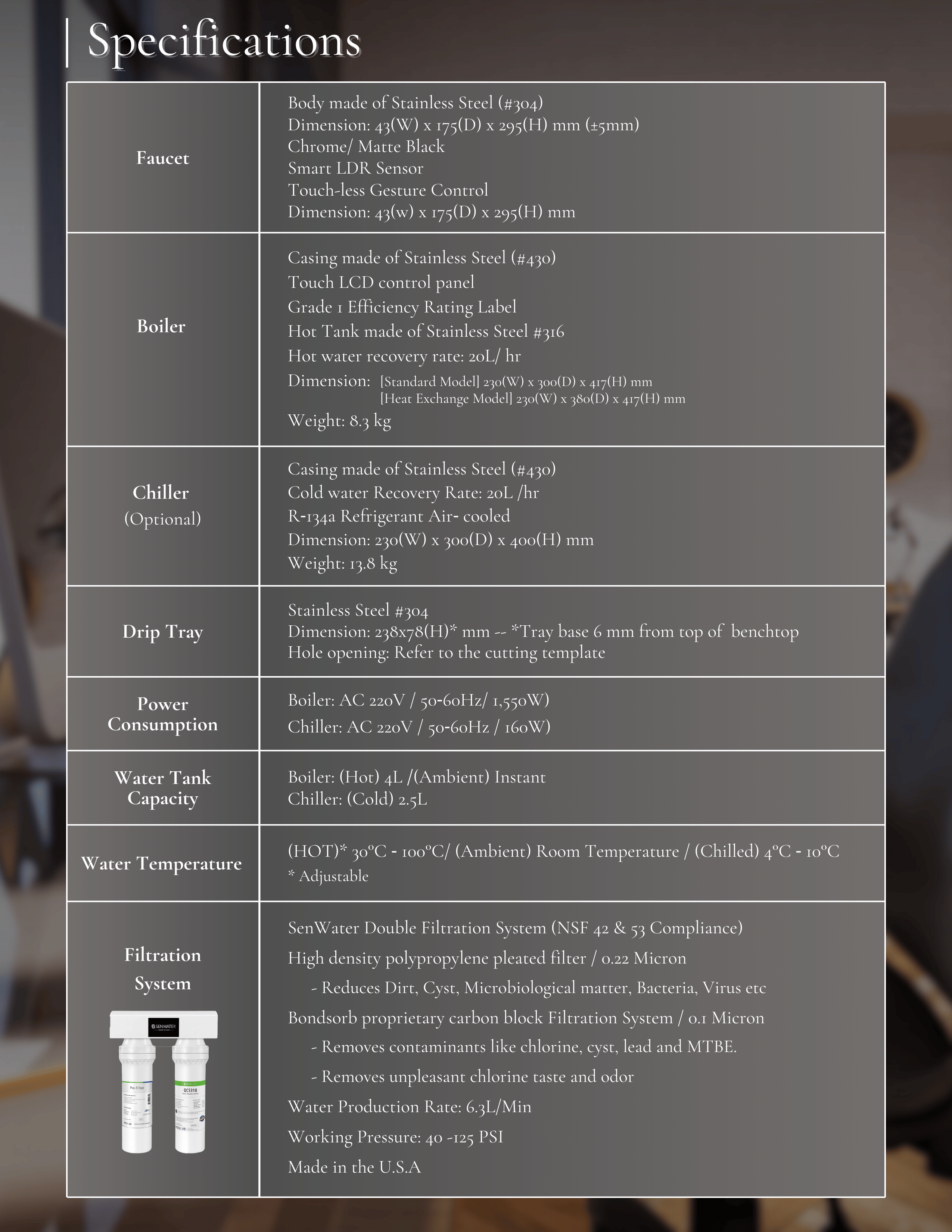 Water temperature: (HOT)* 30°C ‐ 100°C/ (Ambient) Room Temperature / (Chilled) 4°C ‐ 10°C * Adjustable
