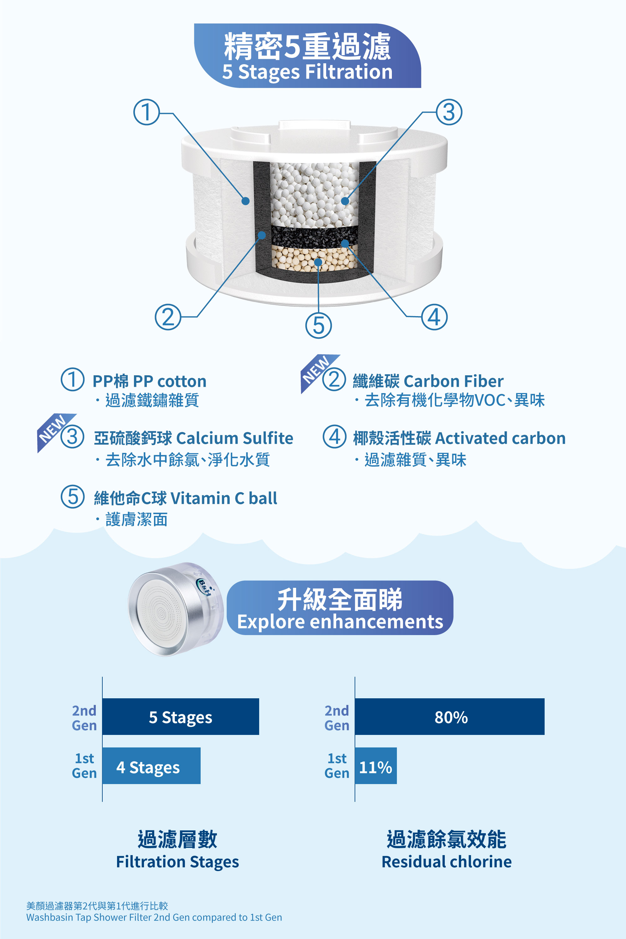 .Combined with calcium sulfite and vitamin C to filter residual chlorine